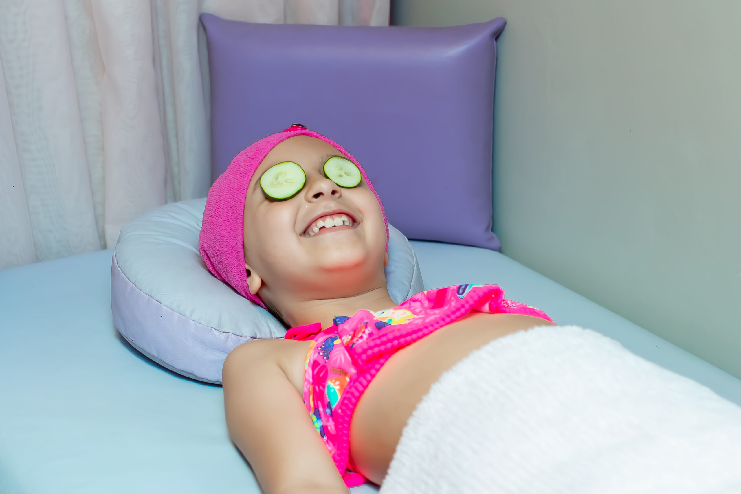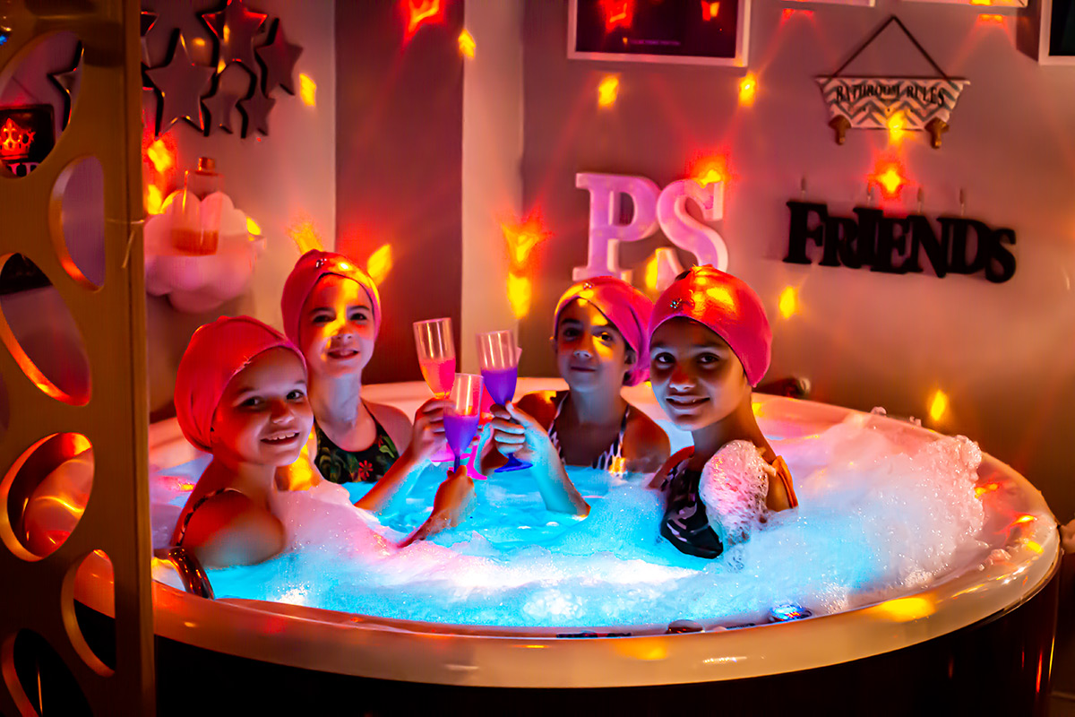 As meninas tomam banheira de banheira com cromoterapia e hidromassagem , num clima super lúdico e divertido , tem esmaltação das unhas , massagem lúdica facial e corporal com pepinos nos olhos. Além disso, ficam ainda mais lindas com o penteado divertido (sem lavar e escovar o cabelo), unha divertida (unha esmaltada e desenhada com o tema